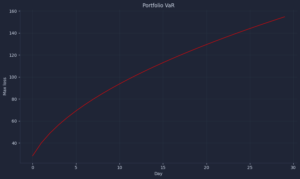This is the desk-standard VaR pipeline: covariance aggregates co-movement across names and weights map that risk into your dollars. The normal model is fast and explainable; at daily horizons, the mean is small and volatility drives the tail. Treat this as a baseline you can backtest against realized losses to spot underestimation during stress.