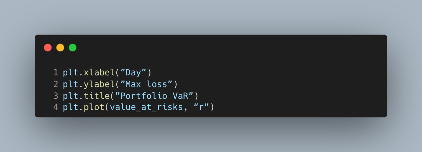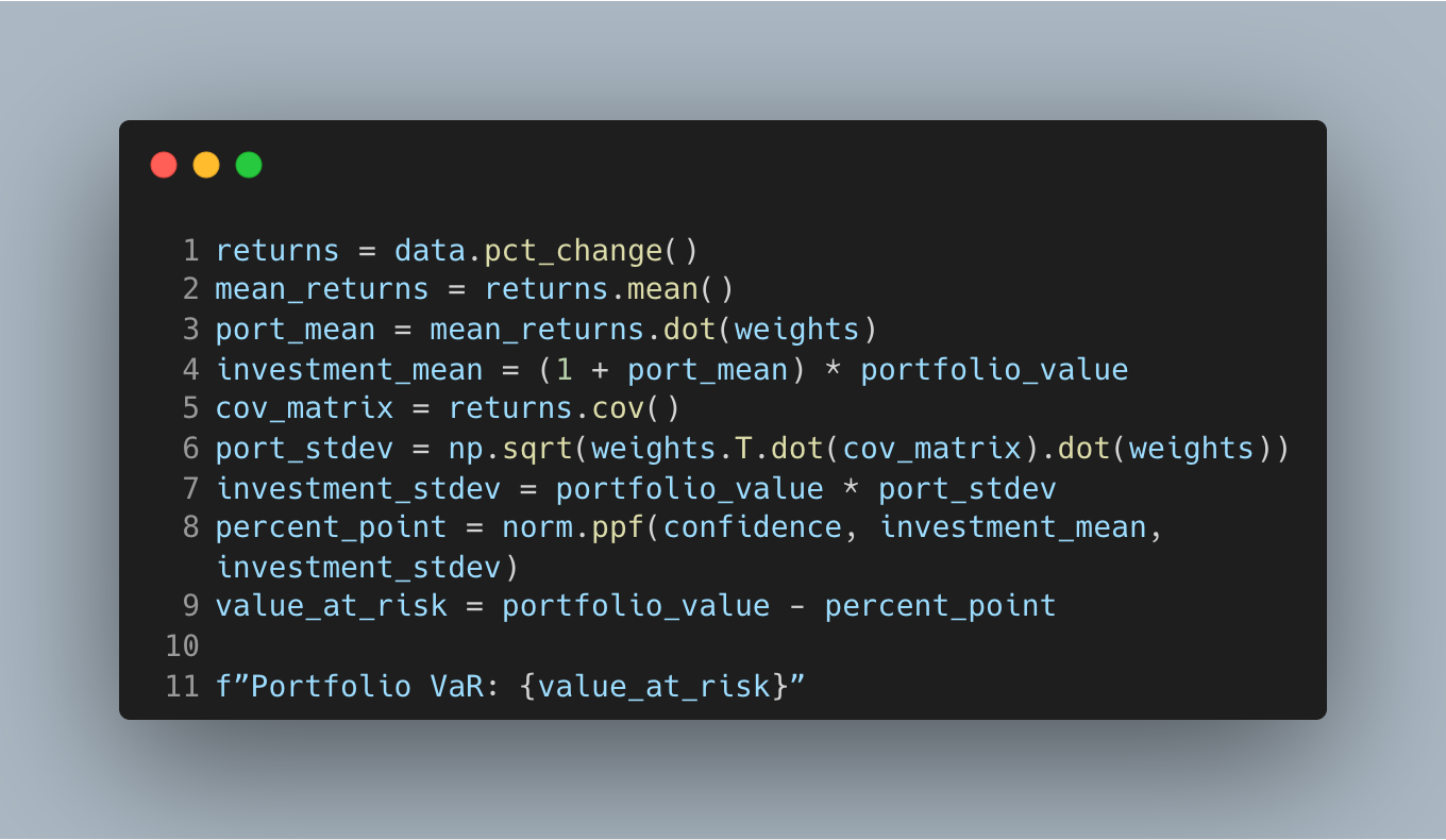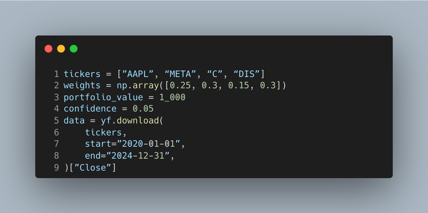 These imports cover a classic variance–covariance VaR workflow: retrieve prices, compute returns and covariances, then map volatility into loss bounds. Keeping this set minimal helps you focus on the model assumptions rather than tooling.