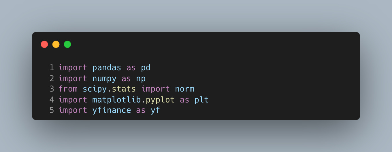 We use pandas for tabular time series handling, numpy for vectorized math, scipy.stats.norm for normal quantiles, matplotlib.pyplot for plotting, and yfinance to download historical prices.