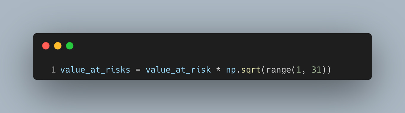Extend the one-day VaR to multiple days using square-root-of-time scaling to get quick, comparable limits across horizons.