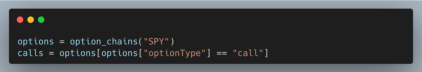 Fetch SPYâs full option chain and isolate calls so our first surface focuses on one option type with a cleaner skew signal.
