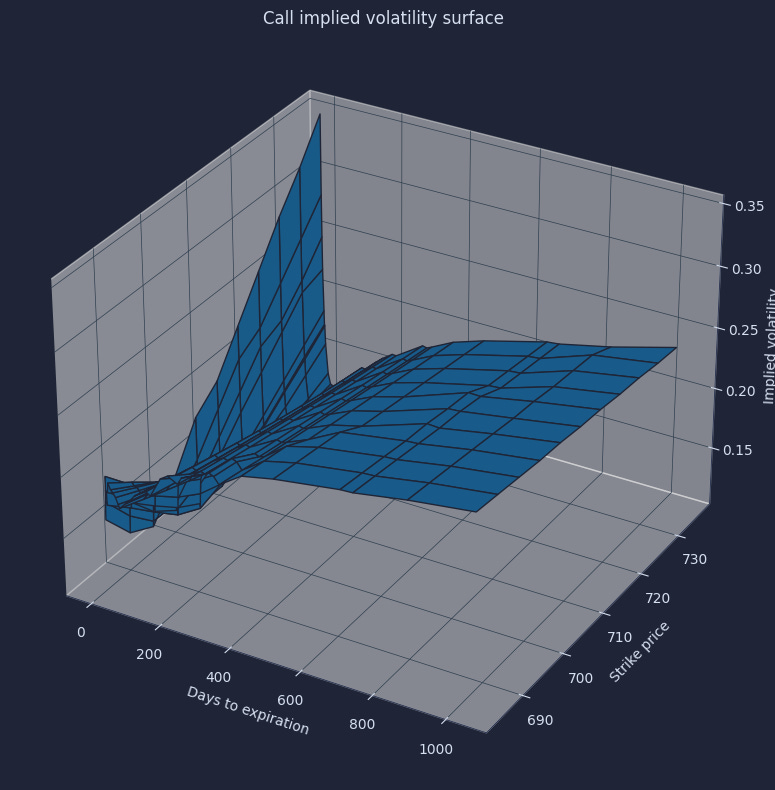 Build a 3D surface plot from the grid so we can see skew and term structure together as one object rather than flipping between expirations by hand.