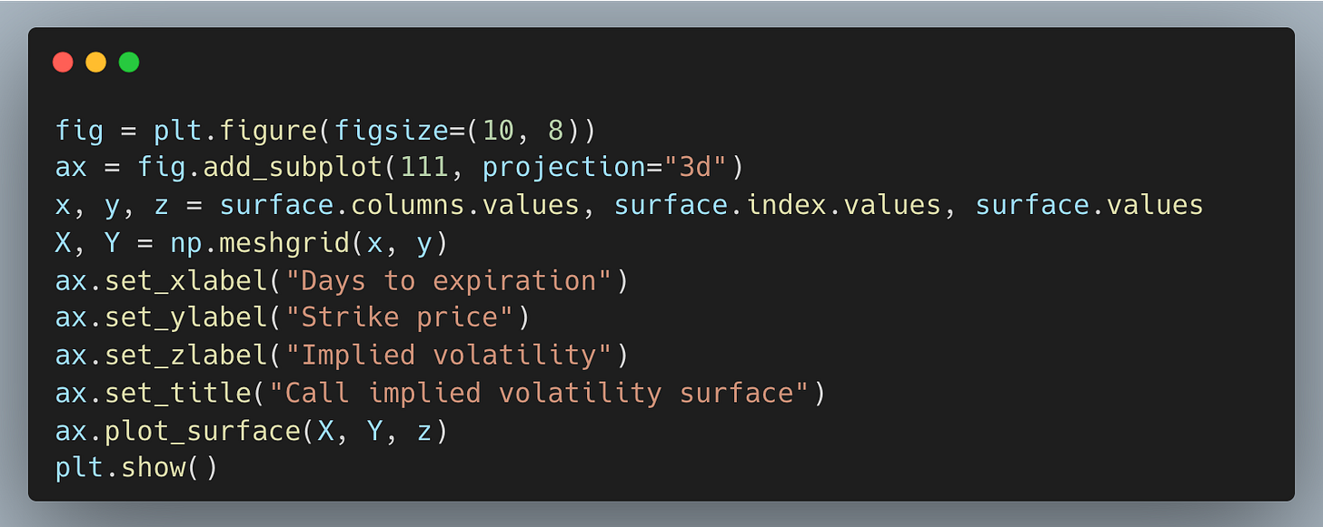In todayâs post, youâll pull live options chains, inspect skew and term structure, and plot a 3D implied volatility surface.