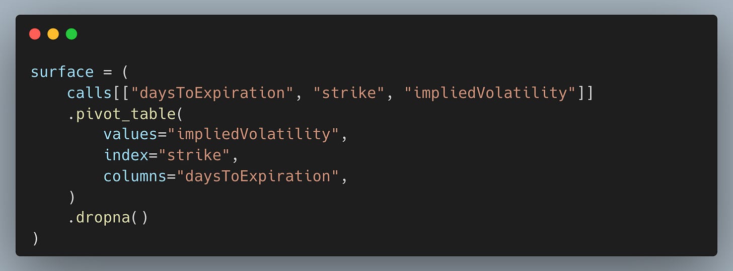Pivoting is the âprofessional workflowâ step in this post: it turns a long options table into a coherent surface you can sanity check, model, and compare over time. Dropping NaNs is a pragmatic way to get a rectangular grid for plotting, but it also teaches an important lesson that real option chains are incomplete, so filtering choices shape what you see.