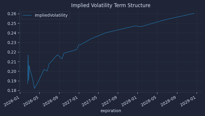 These two â1D cutsâ are the simplest way to stop thinking in single-vol terms: skew tells us how vol changes with strike, and term structure tells us how vol changes with maturity. The small impliedVolatility filter is not cosmetic; it prevents a few bad points from dominating the chart and misleading our interpretation.