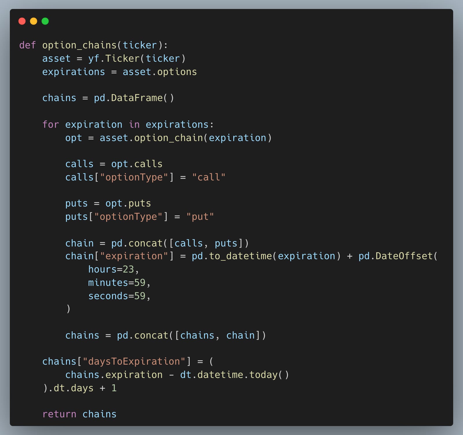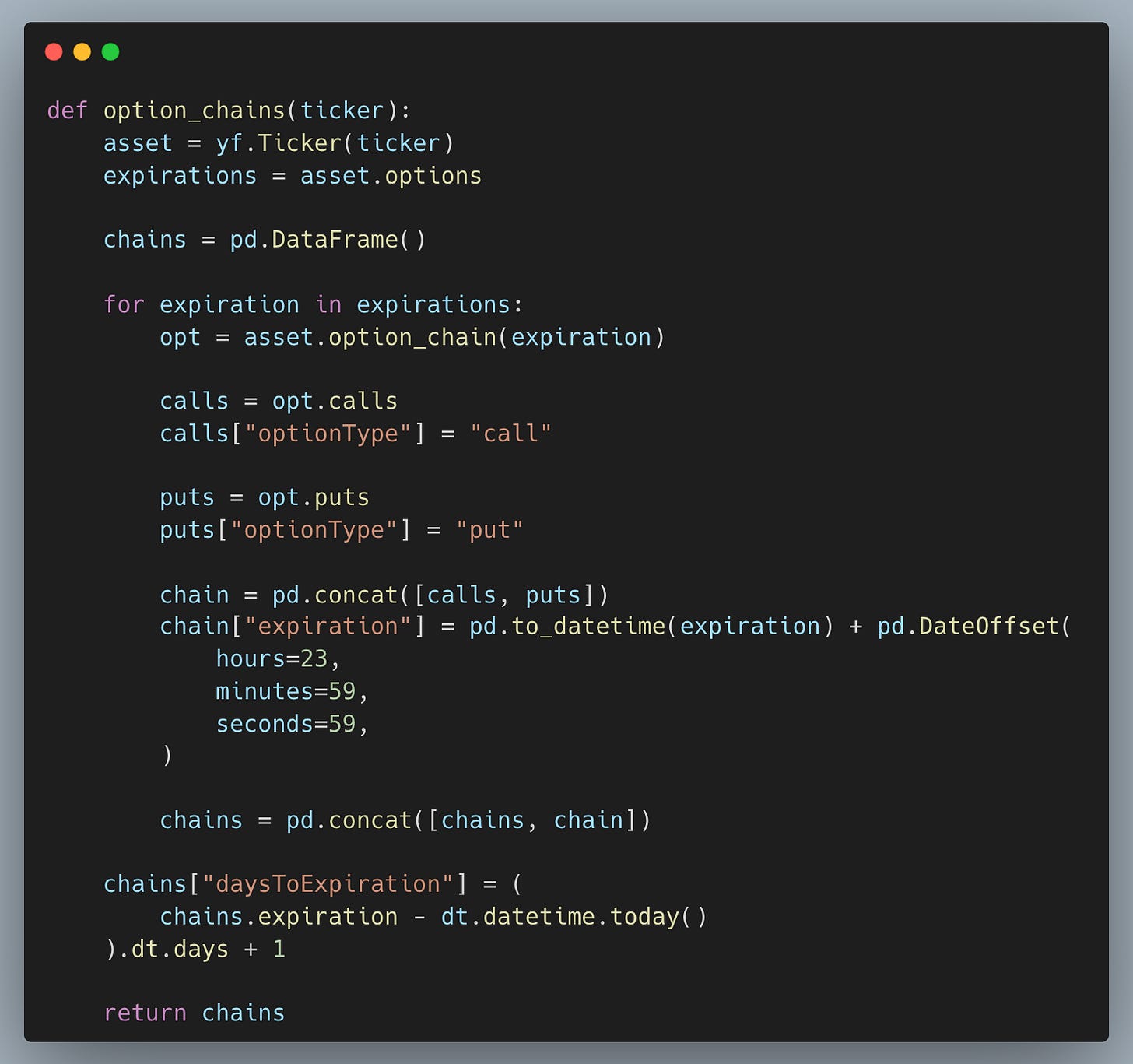 Pull every listed expiration for a ticker and standardize the result into one DataFrame so we can later compare strikes and maturities as a single surface instead of isolated rows.