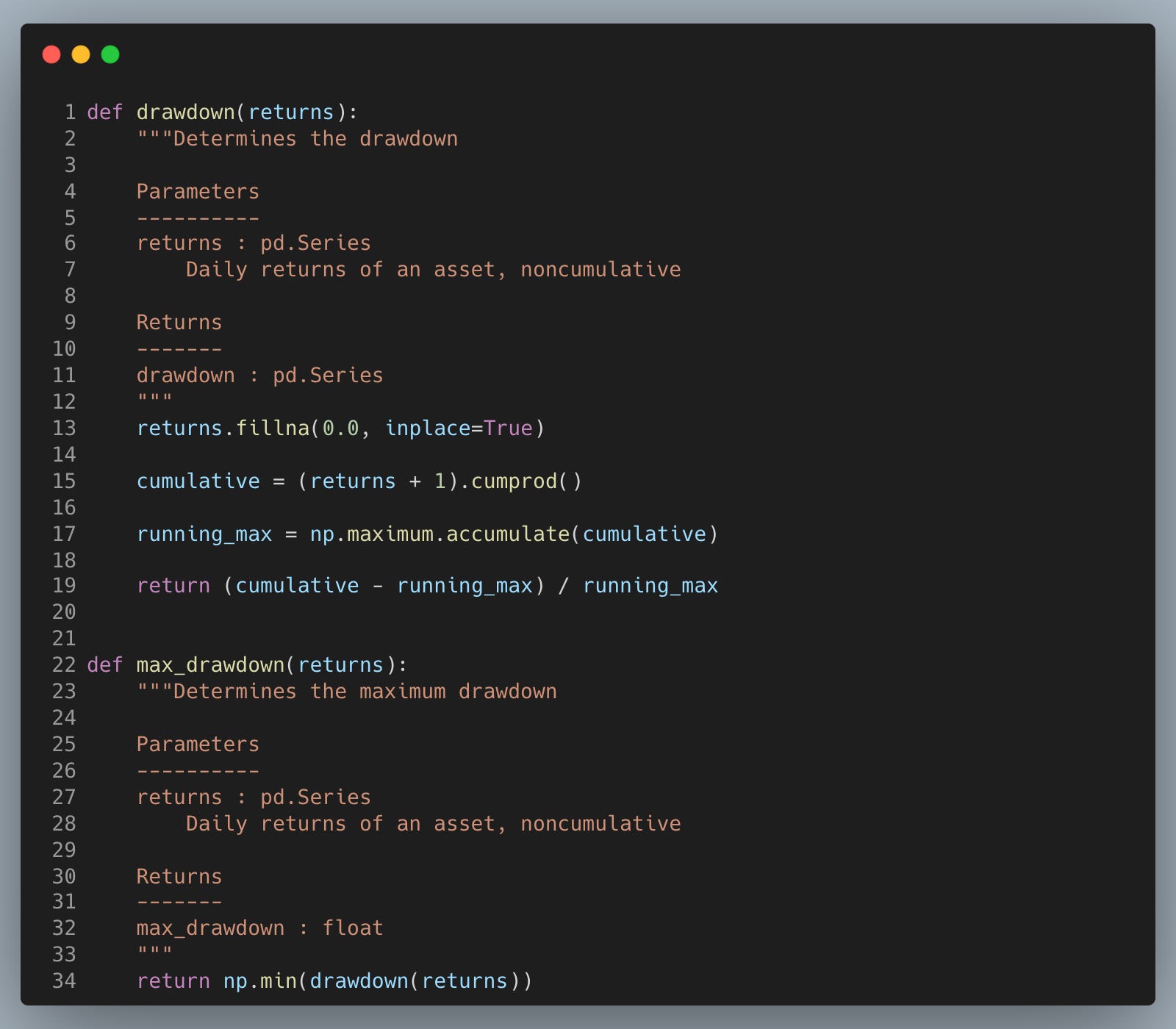 Implement a vectorized drawdown series and a companion max drawdown function so we can reuse the same logic in backtests, dashboards, and rolling risk checks.